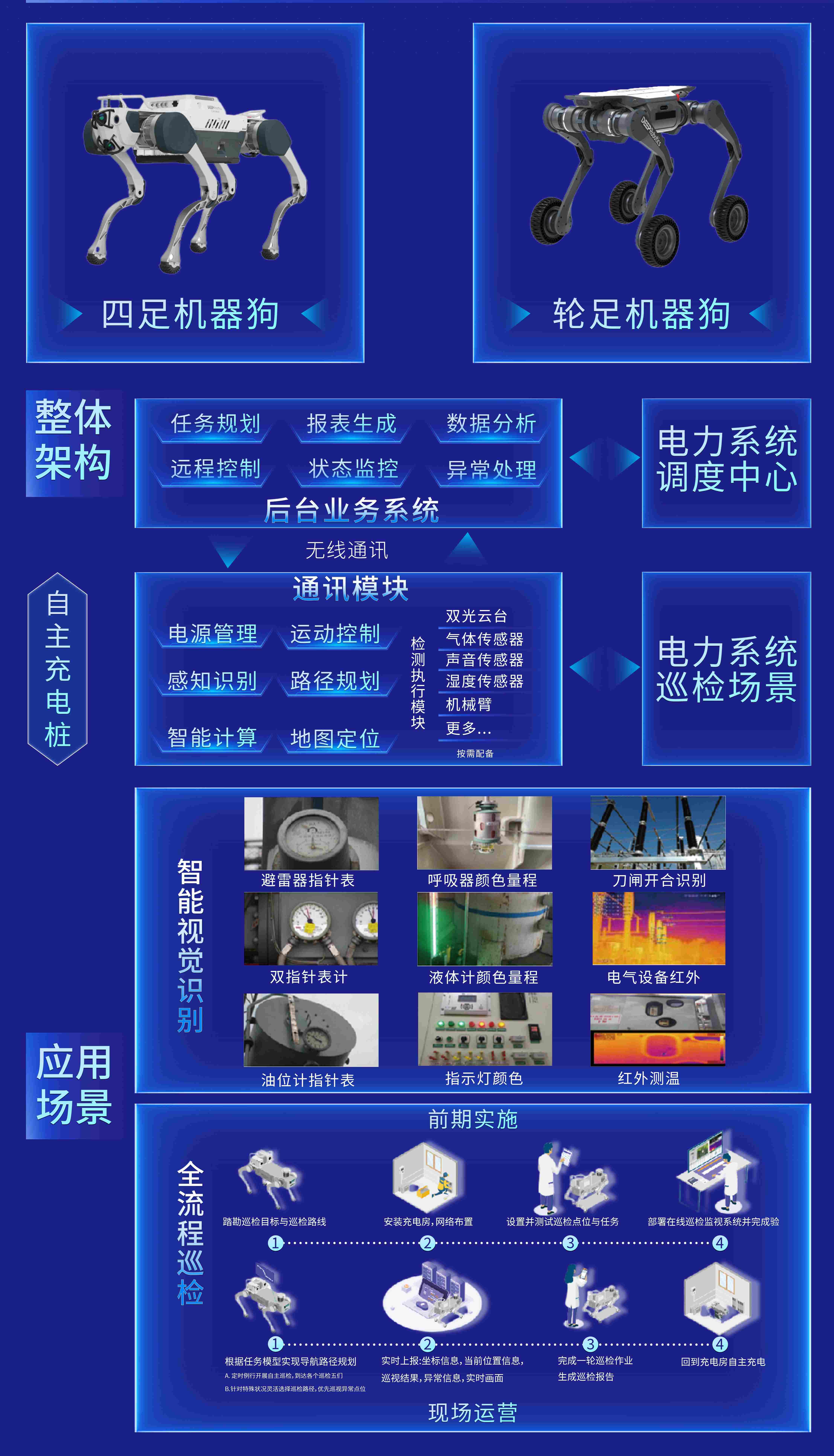 天寬精心打造的智能巡檢解決方案集成巡檢機(jī)器狗、專用監(jiān)測儀器/傳感器、自動充電系統(tǒng)與智能管理系統(tǒng)。憑借AI視覺識別、IoT感知及機(jī)器狗協(xié)作的深度融合,該方案可實現(xiàn)基于路徑規(guī)劃和地圖定位導(dǎo)航的全自主巡查,涵蓋各類表計識別、設(shè)備工況監(jiān)測、局放檢測、溫濕度監(jiān)測、紅外測溫、氣體監(jiān)測、振動監(jiān)測等多項指標(biāo)監(jiān)測,可覆蓋超95%地形場景,定位精度誤差小于3厘米,巡檢識別準(zhǔn)確率高達(dá)95%,加速隱患識別與決策優(yōu)化,助力電力巡檢向精準(zhǔn)化、智能化升級。