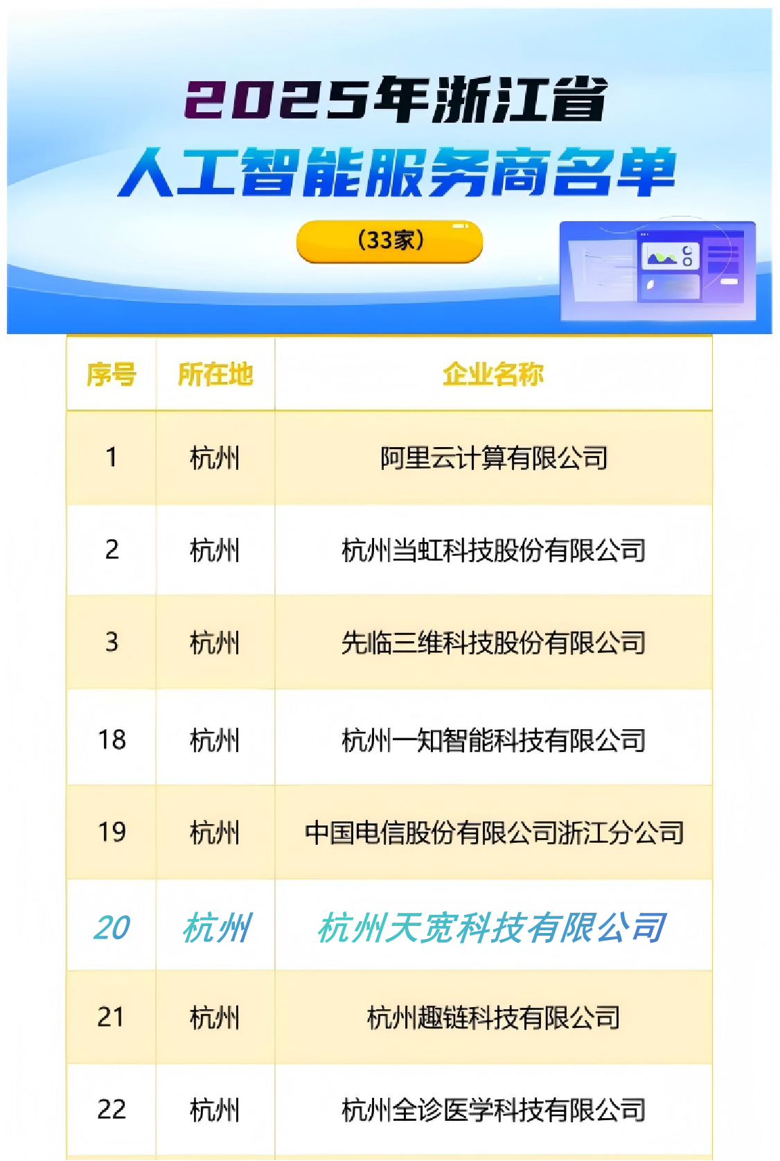 10月11日,浙江省經(jīng)信廳正式公布了《2025年浙江省人工智能應(yīng)用場(chǎng)景、應(yīng)用標(biāo)桿企業(yè)、人工智能服務(wù)商及“數(shù)智優(yōu)品”》遴選結(jié)果。經(jīng)過(guò)嚴(yán)格評(píng)審程序,天寬科技憑借在人工智能技術(shù)研發(fā)、場(chǎng)景落地與綜合服務(wù)能力方面的突出優(yōu)勢(shì),成功獲評(píng)“浙江省人工智能服務(wù)商”。