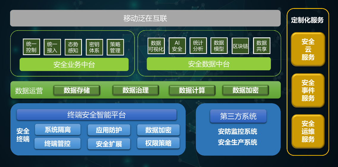 安全的核心是要實(shí)現(xiàn)隔離——“進(jìn)不來”、加密——“進(jìn)來拿不走、拿走打不開”和管控——“拿走留痕跡”。為此,天寬在終端提供“雙域”實(shí)現(xiàn)隔離,并加載了各種先進(jìn)地加密技術(shù),通過“終端安全智能平臺(tái)”進(jìn)行管控,結(jié)合態(tài)勢(shì)感知、人工智能、區(qū)塊鏈等尖端信息化技術(shù),實(shí)現(xiàn)安全的可視化展示。同時(shí),將安全終端與平臺(tái)作為切入點(diǎn),通過集合第三方(類似監(jiān)控、安全生產(chǎn)等)平臺(tái)的數(shù)據(jù),形成天寬面向安全業(yè)務(wù)及安全數(shù)據(jù)的中臺(tái),實(shí)現(xiàn)安全數(shù)據(jù)運(yùn)營(yíng),最終實(shí)現(xiàn)移動(dòng)互聯(lián)泛在終端信息安全。
